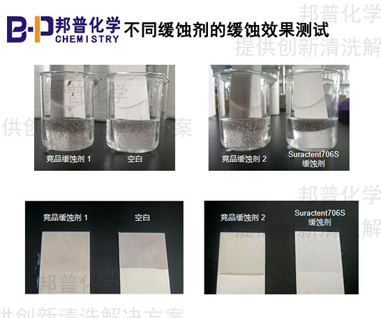 在與其他緩蝕劑的對比測試中,Suractent706S展現(xiàn)了良好的防護(hù)性能(如下圖)。在堿性條件下,使用不同緩蝕劑浸泡處理的鋁合金板,使用Suractent706S緩蝕劑的鋁合金表面幾乎無腐蝕跡象,而對照組則出現(xiàn)不同程度的點蝕或變色現(xiàn)象。Suractent706S能在堿性環(huán)境下表現(xiàn)出更強(qiáng)的緩蝕能力,顯著降低金屬的腐蝕速率,確保工件在清洗后仍保持光潔且均勻的表面狀態(tài)。