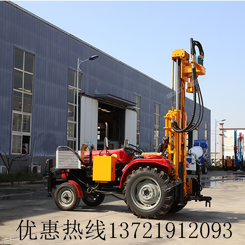 拖拉機(jī)氣動(dòng)打井機(jī) 拖拉機(jī)式水井鉆機(jī)拖拉機(jī)式打井機(jī)概述:本產(chǎn)品是將拖拉機(jī)同氣動(dòng)鉆機(jī)相結(jié)合,形成鉆機(jī) 拖拉機(jī)一體的打井設(shè)備,利于行走和空壓機(jī)的結(jié)合。使施工更加方便、 高效 采用新型液壓技術(shù),配套大扭矩液壓馬達(dá)回轉(zhuǎn)以及大缸徑液壓油缸推進(jìn),名廠多缸發(fā)動(dòng)機(jī)為液壓系統(tǒng)提供動(dòng)力,兩級(jí)空濾以及空壓機(jī)進(jìn)氣設(shè)計(jì),延長(zhǎng)柴油機(jī)的使用壽命 拖拉機(jī)式打井機(jī)特點(diǎn): 適用于工民鉆井、地溫鉆井,具有鉆孔直徑大、鉆孔深、進(jìn)尺快、移動(dòng)靈活、使用地域廣等優(yōu)點(diǎn)。 拖拉機(jī)式打井機(jī)參數(shù): 參數(shù) | 參數(shù)值 | 鉆孔直徑(mm) | Ø110-254 | 鉆孔深度(m) | 200 | 鉆孔方向(°) | 90 | 鉆具一次性推進(jìn)長(zhǎng)度(mm) | 1500 | 鉆具回轉(zhuǎn)速度 | 0~78 | 使用氣壓(Mpa) | 1.3-2.7 | 耗氣量(L/min) | 18 | 總重量(KG) | 2500kg | 拖拉機(jī)型號(hào)(HP) | 40-50 | 鉆桿(mm) | Ø76/89 | 鉆機(jī)尺寸(mm) | 3300*1400*2500 |